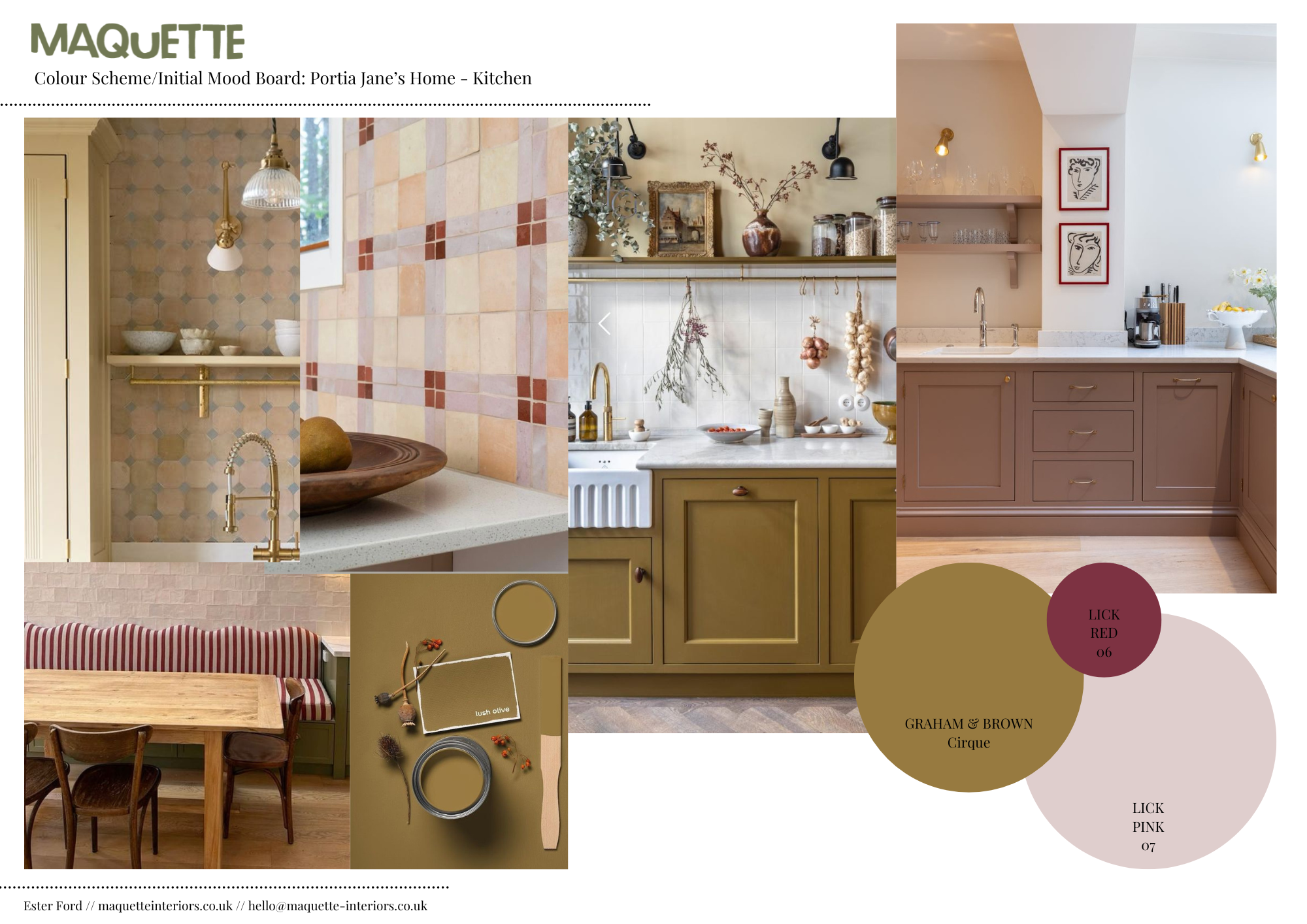 I loved working on this whole home design scheme. We created a scheme for a calm living room with soft pinks and natural woods, and a celebration of family heirlooms. For the main bedroom we introduced a rich gold shade to compliment the pinks and floral patterns that added depth. The furniture for this scheme had playful design elements like bobbles, inlaid stripes and woven rattan. The kitchen is a contemporary space with whimsical elements with hand painted zellige tiles, mixed metals, marble worktops and painted cabinetry in statement colours.